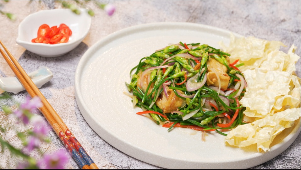 Gỏi Hẹ Hoa Nước Tương kết hợp cùng tàu hủ ky chiên giòn tạo thành một hỗn hợp vừa giòn vừa thơm của các nguyên liệu như hoa hẹ và đậu hủ trắng. Món ăn lạ miệng nhưng lại không khó để chế biến, chắc chắn là một món ăn ngon cần được thêm vào thực đơn cuối tuần của mỗi gia đình.
