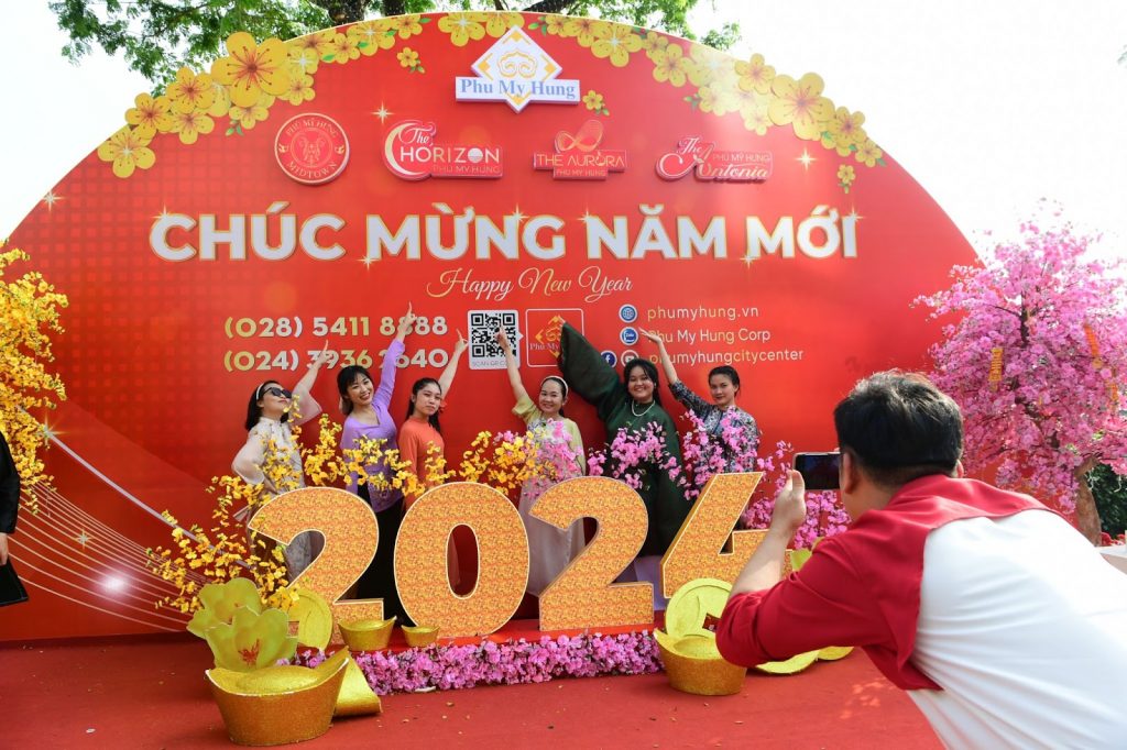 Hội hoa Xuân Phú Mỹ Hưng không chỉ thu hút du khách bởi không khí tràn ngập sắc xuân mà còn là địa điểm lý tưởng để lưu giữ những khoảnh khắc đẹp trong những ngày đầu năm mới. Nhiều bạn trẻ đã cùng bạn bè, người thân đến đây để ghi lại những bức ảnh Tết lung linh, rạng rỡ.