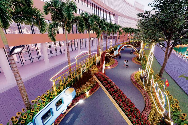 Chủ đề Xuân Gắn Kết được thể hiện đậm nét qua cụm tiểu cảnh Xuân Gắn Kết – Vững Bước Tương Lai nằm ở vị trí trung tâm của Đường hoa Phú Mỹ Hưng 2026. Thiết kế lấy cảm hứng từ tuyến Metro hiện đại, tượng trưng cho sự liên kết và phát triển mạnh mẽ của TP.HCM sau sáp nhập. Bên dưới tuyến Metro uốn lượn là các biểu tượng tiêu biểu của TP.HCM (Nhà Thờ Đức Bà, Chợ Bến Thành, Bưu điện Thành phố), Bình Dương (Tháp Hoa dầu, các khu công nghiệp) và Bà Rịa – Vũng Tàu (ngọn Hải Đăng, tàu đánh cá, sóng biển)… được cách điệu bằng đường nét và ánh sáng.