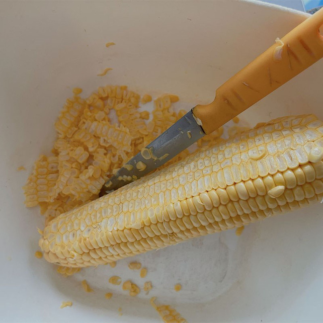 Chị em nhẹ nhàng bóc vỏ ngô, bóc thật khéo để phần vỏ không bị rách nha. Tiếp theo, bạn nhặt bỏ hết râu ngô, dùng dao thái dọc thân ngô để tách hạt. Sau đó, bạn chuẩn bị 1 nồi nước sôi và nhúng phần vỏ ngô vào khoảng 3-5 phút. Làm như vậy, vỏ ngô vừa sạch vừa mềm, khi gói bánh sẽ dễ dàng hơn đó.