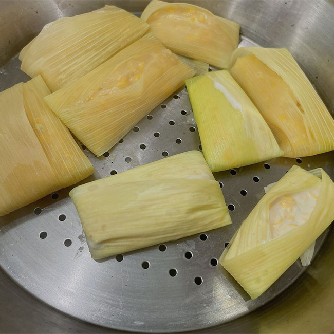 Bạn quét 1 lớp dầu olive vào 1 mặt của miếng vỏ ngô. Múc 1 thìa canh phần bột ngô đã trộn rồi gói lại. Gói xong, bạn cho bánh vào xửng hấp. Hấp khoảng 15-20 phút trên lửa vừa. Cuối cùng, chị em chỉ cần lấy bánh ra đĩa, bóc lớp vỏ ngô bên ngoài đi là có thể thưởng thức được rồi.